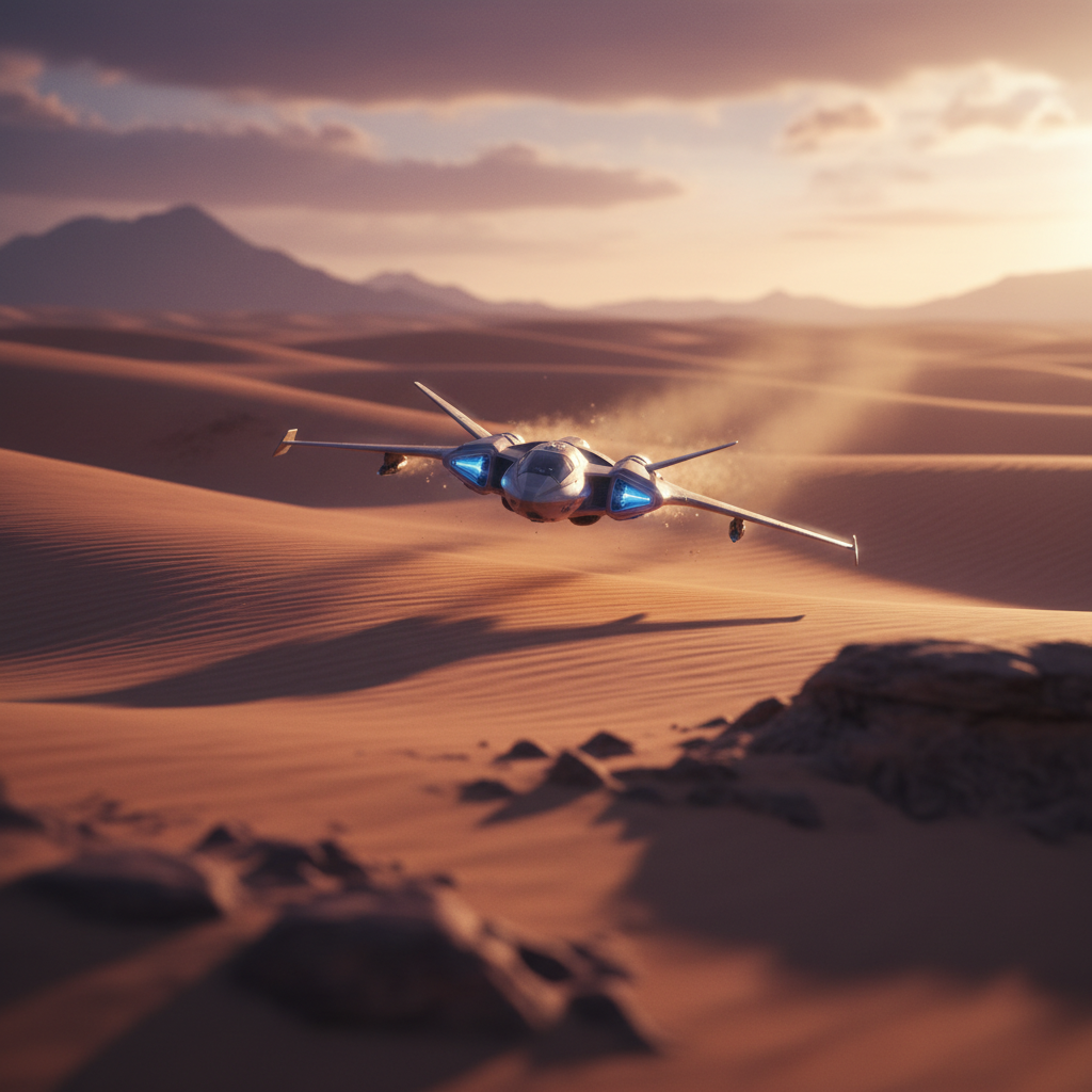 Aerial-to-low-angle cinematic shot over massive dunes on Arrakis with drifting sand.