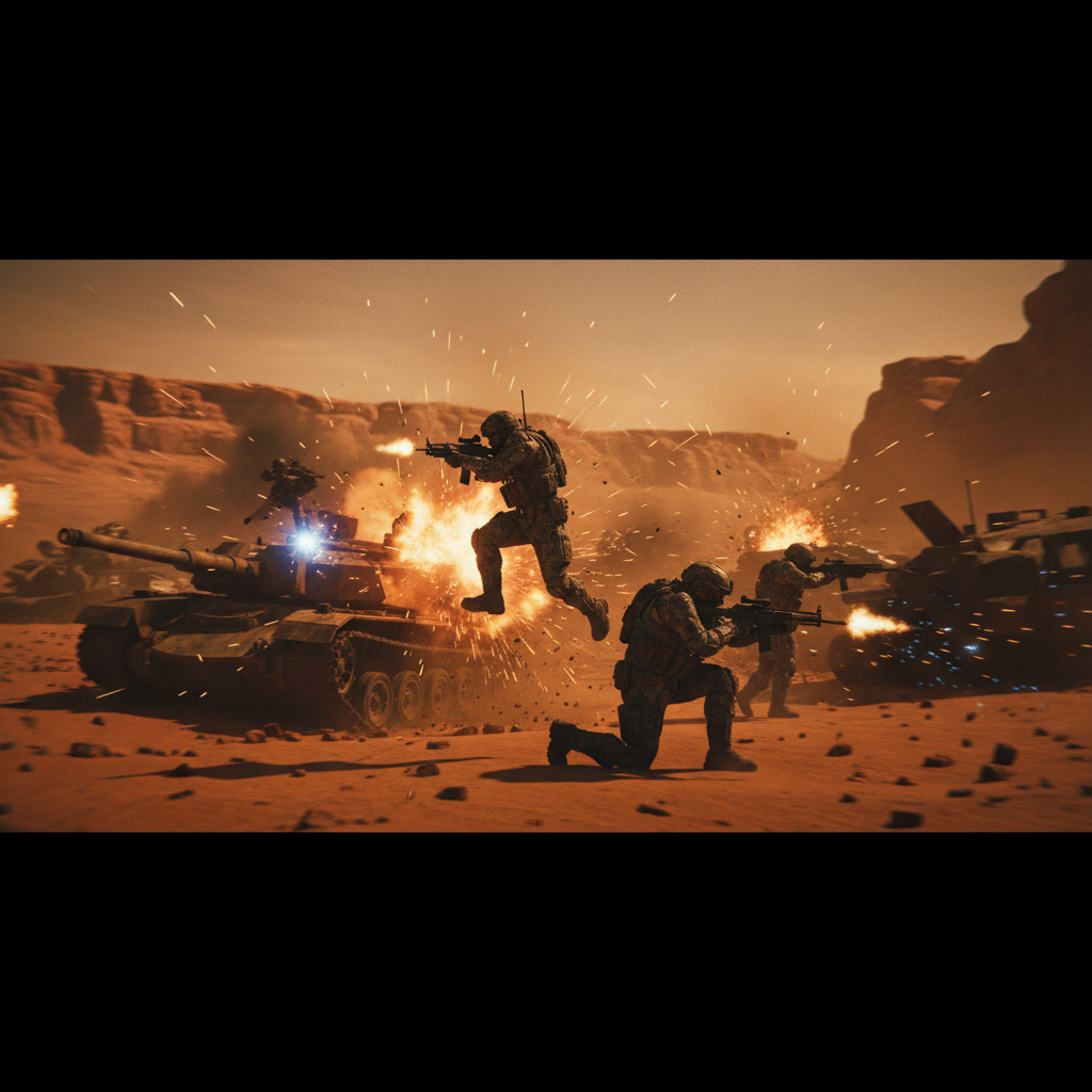 [CAMERA] Ultra-wide lens, low angle, slow push-in, heat haze visible.